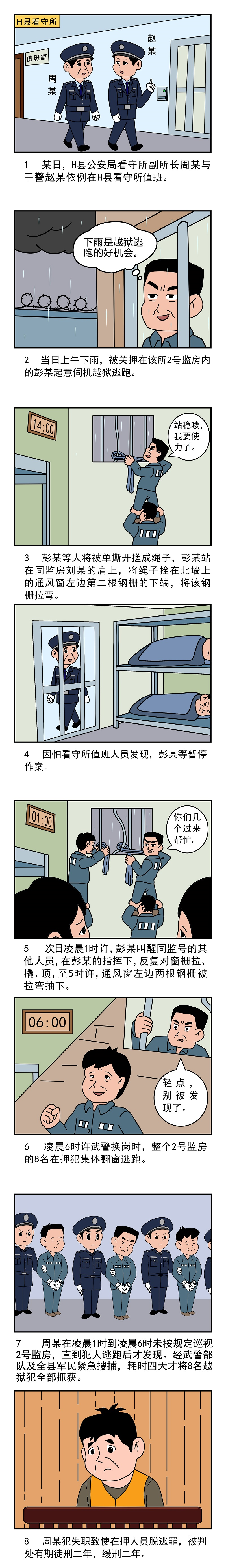 某日,H县公安局看守所副所长周某与干警赵某依例在H县看守所值班。当天上午下雨,被关押在该所2号监房内的彭某起意伺机越狱逃跑。当天下午2时许,彭某等人将被单撕开搓成绳子,彭某站在同监室在押人员刘某的肩上,将绳子拴在北墙上的通风窗左边第二根钢栅的下端,将该钢栅拉弯。因怕看守所值班人员发现,彭某等暂停作案。次日凌晨1时许,彭某叫醒同监号的其他人员,在彭某的指挥下,反复对窗栅拉、撬、顶。至凌晨5时许,才将通风窗左边两根钢栅拉弯抽下。凌晨6时许,趁武警换岗时,整个2号监房的8名在押犯集体翻窗逃跑。周某在凌晨1时到凌晨6时未按照要求进行巡视和检查,直到犯人逃跑后,值班人员周某才发现。经武警部队及全县军民紧急搜捕,耗时四天才将8名越狱犯全部抓获。