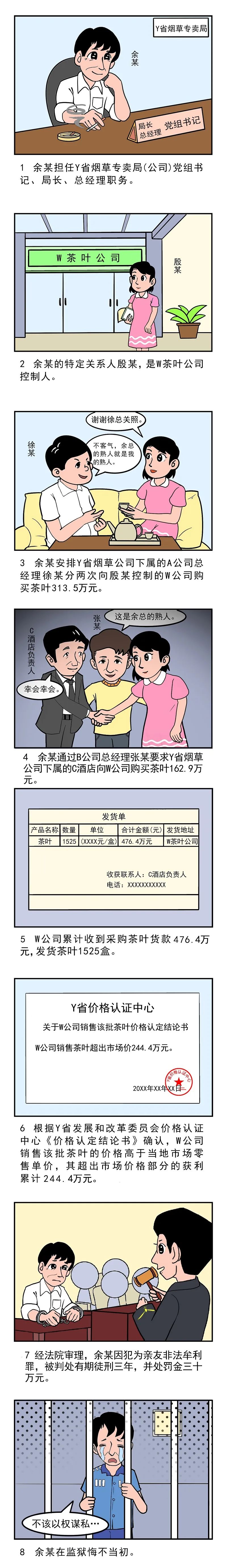 余某在担任Y省烟草专卖局(江南(中国)官方)党组书记、局长、总经理职务期间,以卷烟配套宣传用礼品的名义,安排Y省烟草江南(中国)官方下属的A江南(中国)官方总经理徐某分两次以315.5万元的价格向殷某(余某的特定关系人)控制的W江南(中国)官方购买茶叶;通过B江南(中国)官方总经理张某要求Y省烟草江南(中国)官方下属的C酒店向W江南(中国)官方购买茶叶162.9万元。W江南(中国)官方累计收到采购茶叶货款人民币476.4万元,发货茶叶1525盒。根据Y省发展和改革委员会价格认证中心《价格认定结论书》确认,W江南(中国)官方销售该批茶叶的价格高于当地市场零售单价,其超出市场价格部分的获利累计人民币244.4万元。